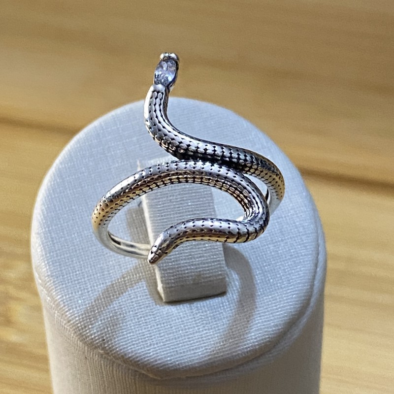 Anel em Prata 925 com design de serpente enrolada, corpo texturizado que imita escamas e aro frisado para acabamento elegante. A cabeça da cobra traz uma zircônia brilhante que realça o movimento da peça, criando um contraste sofisticado entre o aspecto rústico das “escamas” e o brilho delicado da pedra. Peça statement, com personalidade forte — perfeita para quem busca um acessório com atitude sem abrir mão da delicadeza do acabamento em prata.