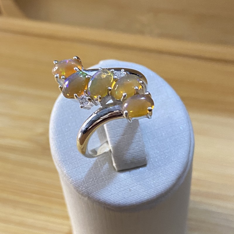 Encanto em formato bypass com um conjunto de opalas amarelas em lapidação cabochon dispostas em leve curva sobre o aro. O trabalho em prata 925 realça o brilho ambarino das opalas, enquanto pequenos pontos de brilho complementam o arranjo, criando um efeito luminoso e sofisticado. O design em duplo aro cruzado confere personalidade e uma silhueta elegante, perfeita para quem procura uma peça que una cor e movimento.