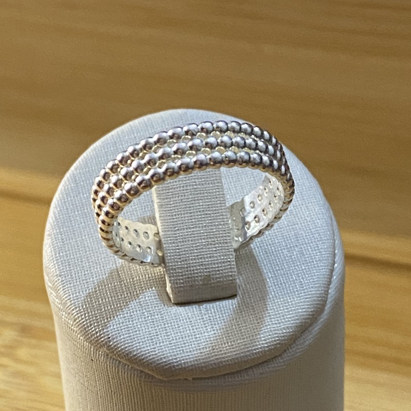 Anel em Prata 925 com design texturizado composto por três fileiras de bolinhas uniformes que percorrem a superfície do aro. O relevo das bolinhas cria um efeito visual elegante e tátil, perfeito para quem gosta de peças com personalidade sem perder a versatilidade. Acabamento polido nas laterais e por dentro do aro para maior conforto ao usar; estrutura sólida que mantém a forma mesmo com uso diário. Ideal tanto sozinho, realçando um look minimalista, quanto em combinações com anéis finos para um mix moderno.