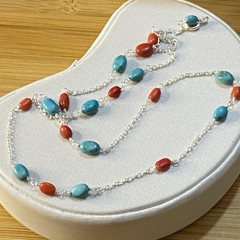 Elegante e leve, este colar em prata 925 traz pedras ovais de turquesa e coral alternadas, realçando o contraste das cores com um toque natural e sofisticado. Com 45 cm, tem caimento curto perfeito para usar sozinho ou em camadas.