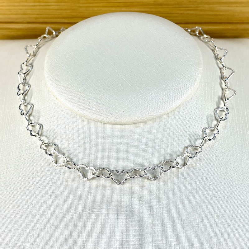 Romântica e super brilhante, esta corrente em prata 925 é formada por elos de coração com acabamento diamantado, que reflete a luz lindamente. Disponível em 40 cm (efeito choker) e 45 cm (caimento curto), perfeita para usar sozinha ou em camadas.