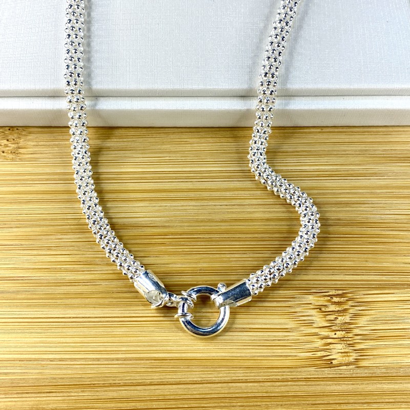 Imponente e super brilhante, esta corrente em prata 925 traz a malha pipocão de esferas polidas e fecho bóia, garantindo presença e segurança. Com 45 cm, tem caimento curto e elegante — perfeita para ser a protagonista do look.