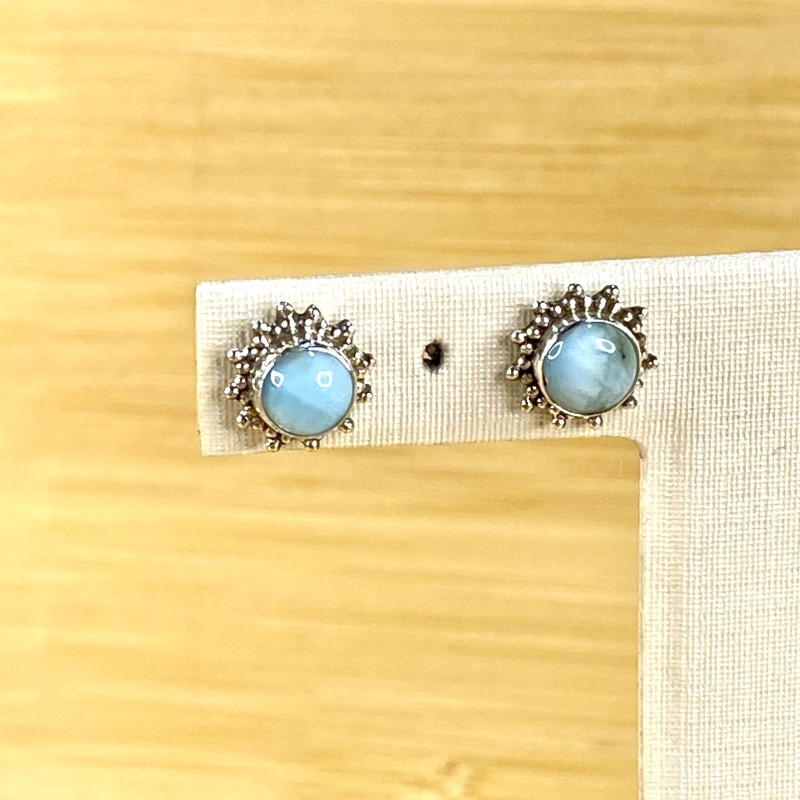 Delicado e encantador, este mini brinco em prata 925 traz a pedra natural larimar no centro, envolvida por uma borda detalhada que valoriza ainda mais sua beleza única. Uma peça charmosa e versátil para iluminar o visual.