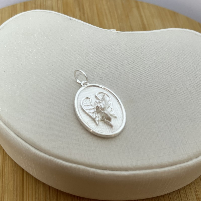 Este pingente de Arcanjo em Prata 925, no formato oval e com 2cm, traz o símbolo do guardião celestial em alto-relevo, representando coragem, justiça e proteção divina.