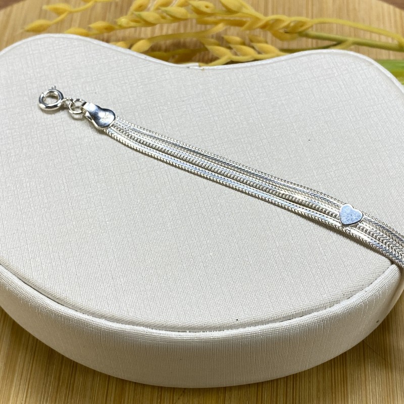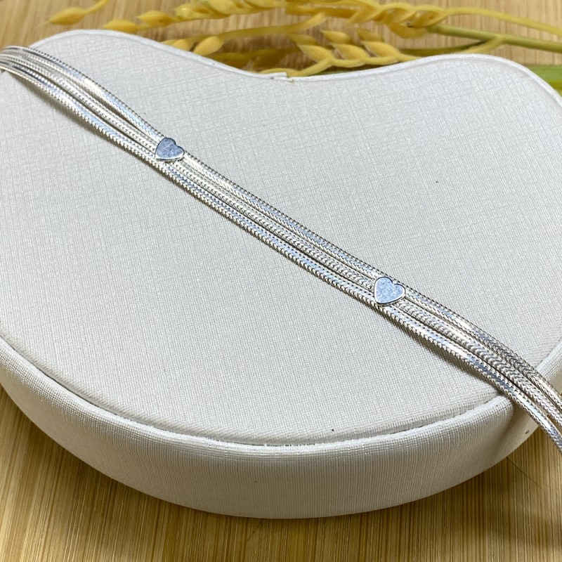A Pulseira 3 Fitas com Aplique de Coração — Prata 925 (18 cm) é a combinação perfeita entre delicadeza e modernidade. São três fios finos e alinhados que percorrem o pulso em harmonia, unidos por pequenos apliques em formato de coração que dão aquele ponto de charme sem pesar. O acabamento polido da prata 925 garante brilho suave e elegante, enquanto o comprimento de 18 cm oferece caimento confortável — ótima para quem gosta de peças femininas que funcionam tanto sozinhas quanto em sobreposições. Fecho tipo lagosta para vestir com segurança. Peça versátil, romântica e super atual.