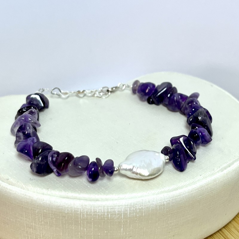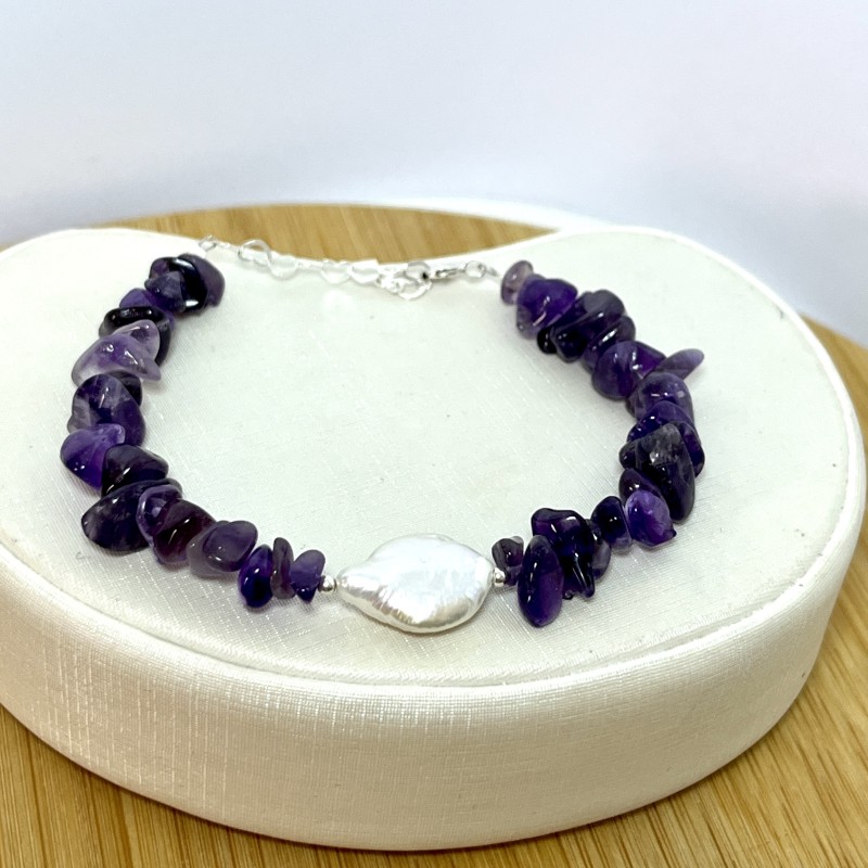 A Pulseira de Ametista com Pérola Biwa em Prata 925 une duas preciosidades muito especiais: