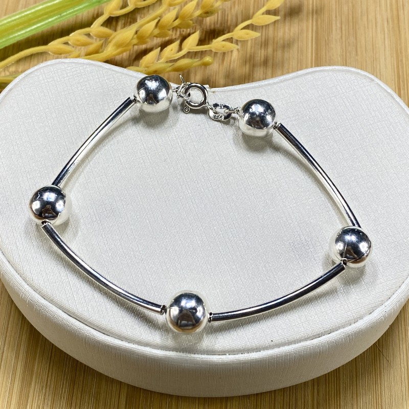 A Pulseira de Bolas de 8mm e Tubos Alongados em Prata 925 é uma peça que une presença e elegância com simplicidade moderna. Confeccionada em prata 925 de alta qualidade, traz bolas polidas de 8 mm intercaladas por tubos alongados que alongam visualmente o pulso e adicionam um ar arquitetônico ao design. O acabamento polido garante brilho intenso e um reflexo sofisticado que chama atenção sem ser exagerado.