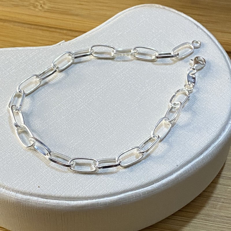 Minimalista e elegante, esta pulseira em prata 925 apresenta elos alongados com acabamento polido e fecho mosquetão, perfeita para usar sozinha ou em composição com outras peças.
