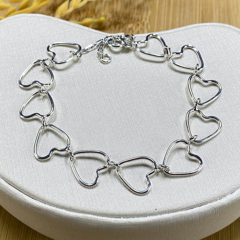 A Pulseira Elos Corações em Prata 925 (19 cm) é delicada e cheia de doçura: formada por corações vazados que se interligam, cria um desenho leve e romântico no pulso. Confeccionada em prata 925 com acabamento polido, oferece brilho duradouro e caimento confortável. Vem com fecho resistente e argolinhas de ajuste, facilitando o uso no dia a dia. Versátil, funciona sozinha como peça-foco ou combinada com outras correntes finas para um mix super feminino.
