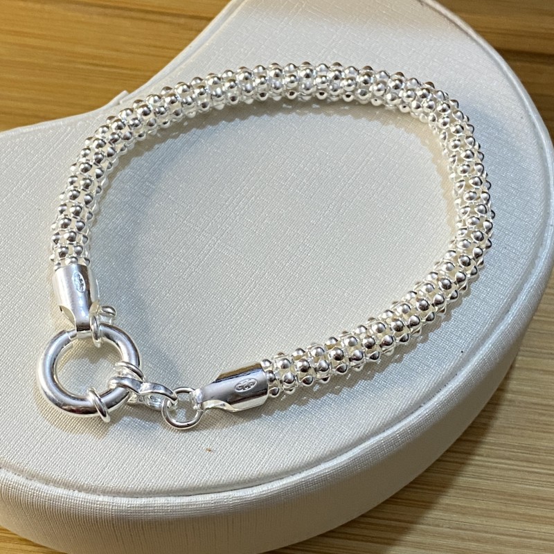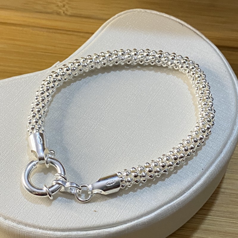 Clássica e poderosa, esta pulseira em prata 925 traz a malha pipocão — bolinhas volumosas que refletem a luz com muito brilho. O fecho bóia garante segurança e um toque moderno, perfeita para usar no dia a dia ou como peça-chave no mix.