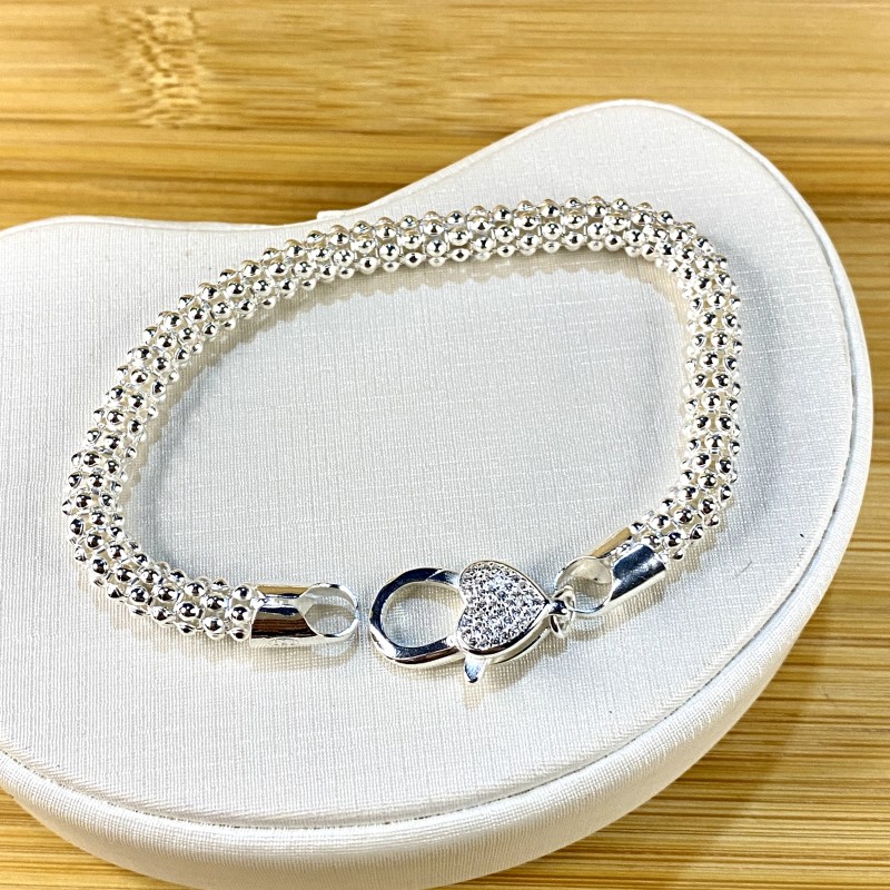 Pulseira em prata 925 no estilo pipocão, com fecho em formato de coração cravejado de zircônias, que une charme e praticidade em uma só peça. Com 19 cm de comprimento, é perfeita para quem busca um acessório elegante e cheio de significado.